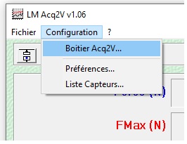 Dans Configuration / Boitier Acq2V, vérifier et modifier si besoin les réglages comme ci-dessous :