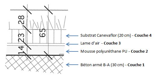 Le modèle de comportement thermique permet de déterminer par simulation les températures à travers les couches de l’enveloppe du toit végétalisé. La solution d’isolation utilisant une enveloppe végétalisé comprend 4 couches.