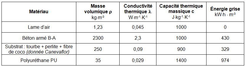 Question 2 - Compléter sur le document DR1 les paramètres d’entrée du modèle de comportement thermique à l'aide des Données météorologiques en ressources, de la présentation de la solution Canevaflor ci-dessus et du tableau ci-dessous.