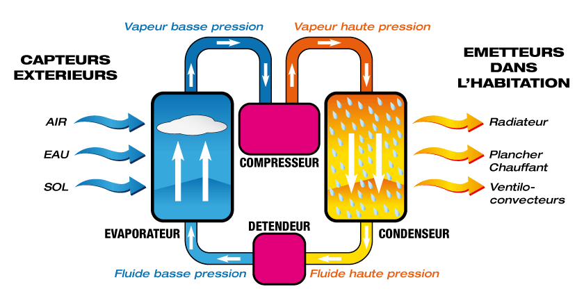 La chaleur prélevée dans le sol, l'air ou l'eau est transférée au fluide frigorigène par l'évaporateur. Ensuite, le compresseur fait augmenter la température du fluide et le fait passer à un état gazeux. Ce fluide gazeux cède sa chaleur à celui du circuit de chauffage (fluide frigorigène ou eau) par le biais du condenseur qui lui redonne son état liquide. En passant dans le détendeur, la pression comme la température du fluide vont diminuer, avant qu'il soit réinjecté dans le circuit extérieur.