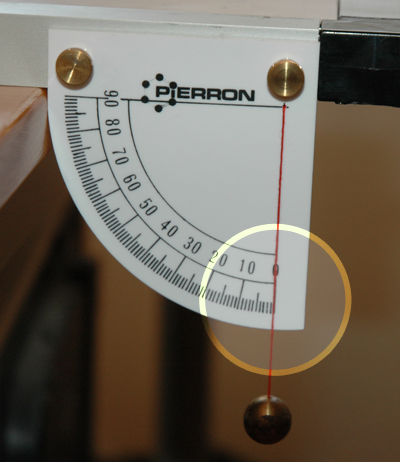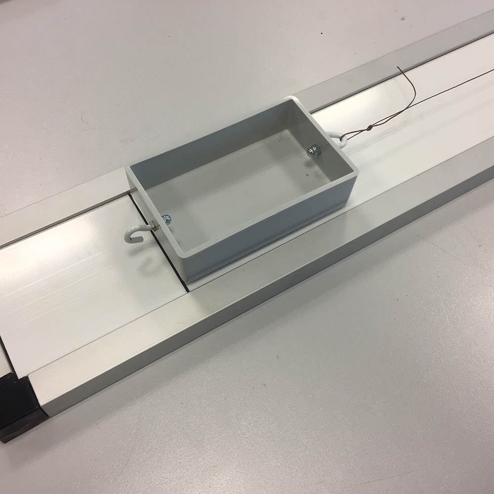 Poser le chariot sur le plan en plastique, aligné sur le repère. Passer la ficelle, du support, dans la poulie et accrocher une masse de 10 grammes.